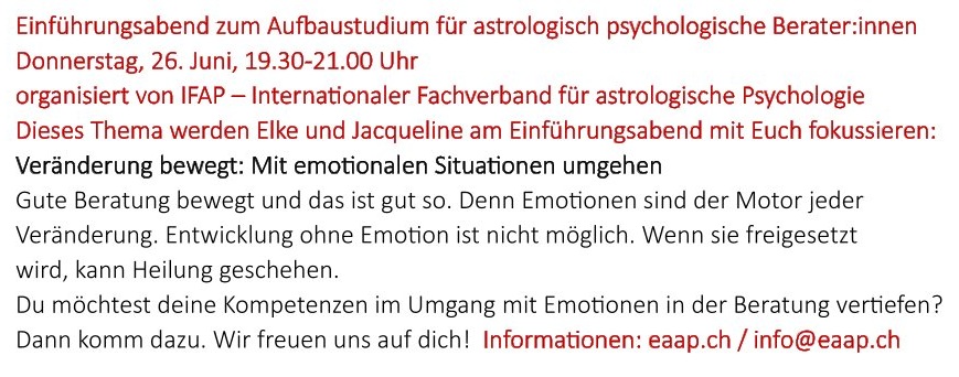 EAAP Bern bietet nebst den Grundkursen – Start im September 2025 – und der laufenden Beratungsausbildung – Quereinstiege möglich! – auch ein Aufbaustudium für astrologisch psychologische Berater:innen an. Sowohl im Aufbaustudium wie in der Beratungsausbildung arbeite ich mit Elke Schlehuber von Prozessinstitut Zürich zusammen. Folgend sind alle PDF’s mit ausführlichen Infos verlinkt: